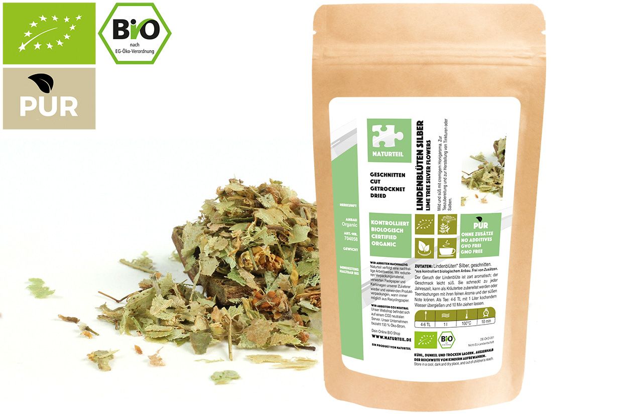 Der zart aromatische Geruch und der leicht süße Geschmack machen Lindenblüten zu einer beliebten Zutat für Kräutertees und Teemischungen. Die Silberlinde, auch Sommerlinde genannt, blüht bereits im Juni und gehört zu den frühesten Lindenarten.