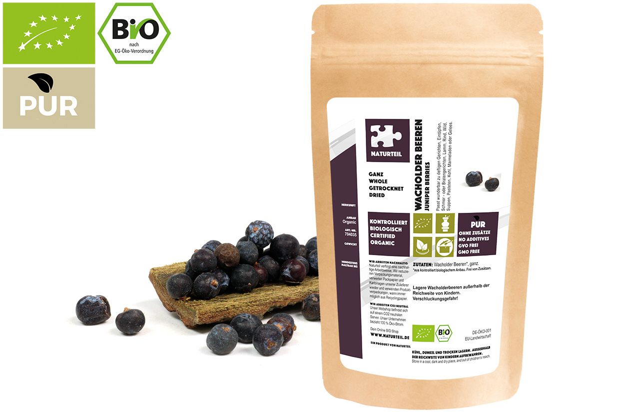 Dunkelviolett mit süß-holzigem, leicht bitterem Geschmack. So kennen wir die Wacholderbeere als Würze für deftige Fleisch- und Wildgerichte oder Sauerkraut. Wacholderbeeren verfeinern jedoch auch den Geschmack von Konfitüren, Marmeladen, Gelees und Süßspeisen. Weiße Punkte an der Oberfläche der Beere sind ein vollkommen normales Zeichen für deren Fruchtzuckergehalt, der durch die Poren der Beerenhaut austreten kann.